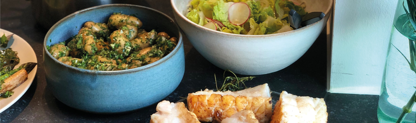 Alt imens dette gøres, stikker du løbende en kødnål ind i fileten for at tjekke temperaturen. Kødnålen skal helt ind ved benet, så spidsen rammer ca. midten af kødet. Tjek temperaturen ved at lægge nålen på underlæben for at følge med i, hvor langt du er i stegningen. Når fiskens temperatur er tæt på din kropstemperatur, tages den af panden for at hvile i mindst 8 min.