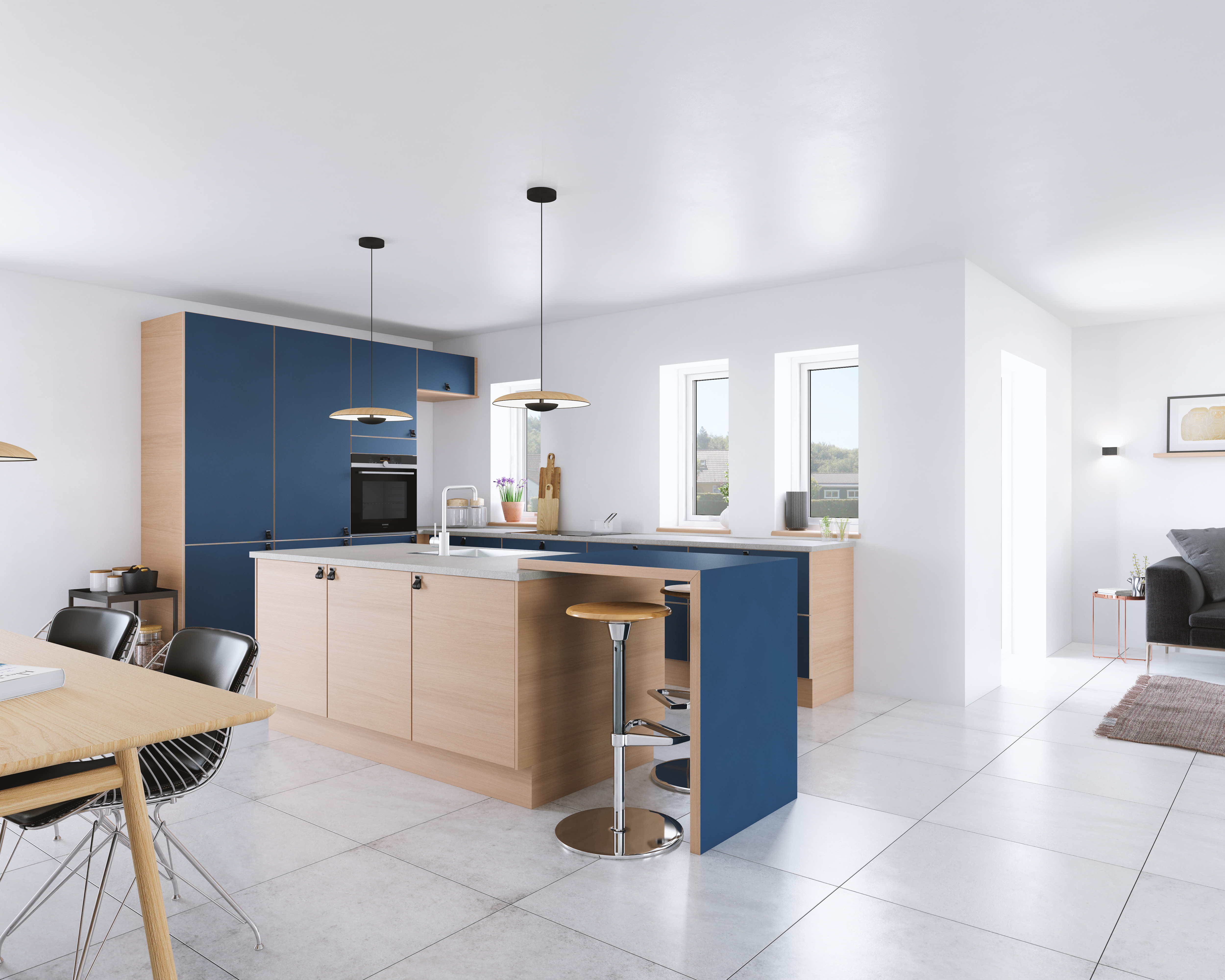 - Linoleum Blå/Natur Eg Køkken: En eksklusiv linoleumsfront i 24 mm med massivtræskanter – her vist med lædergreb. Bemærk frisider, sokler og låger på øen, som er udført i en finér i natur eg og skaber en flot kontrast til den blå linoleum. Vejl. pris: 71.239,- inkl. skabe, sokkel, bordplader og bro i linoleum med kant i massiv træ. Ekskl. hvidevarer, vask, armatur og belysning.